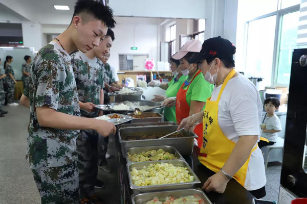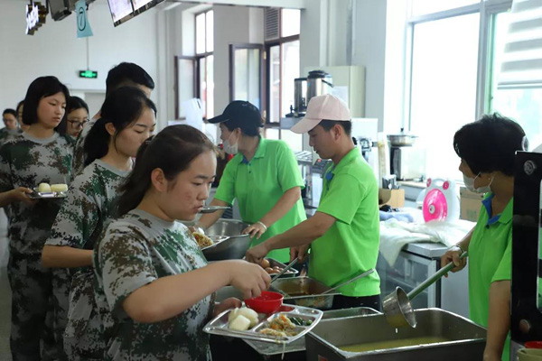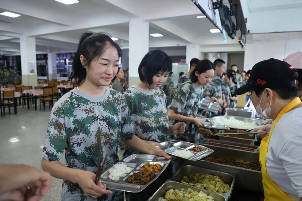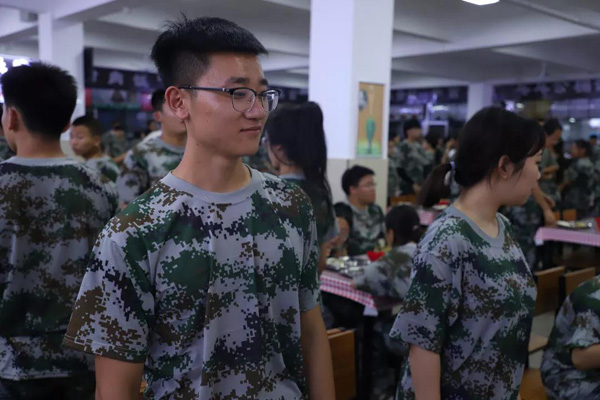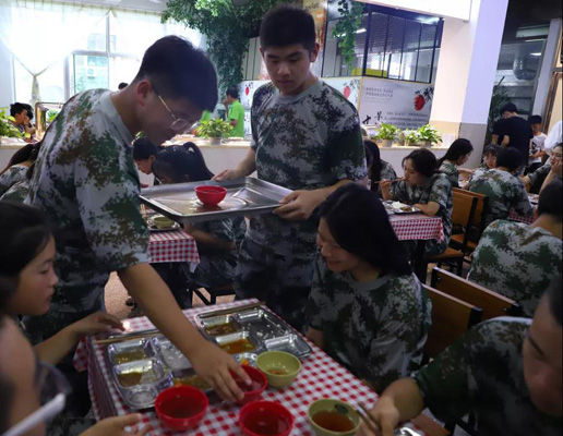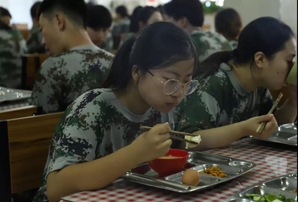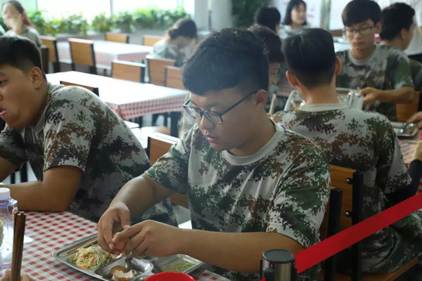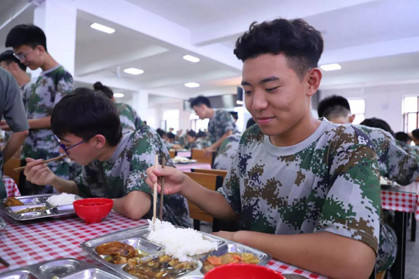 每天午餐前,教官们都会组织各班级进行拉歌,这样不仅可以增强士气,也利于同学们保持愉悦的心情就餐。同学们看到可口的饭菜不禁露出了美滋滋的笑容。