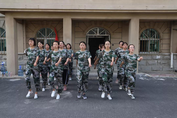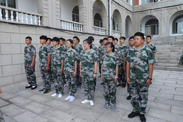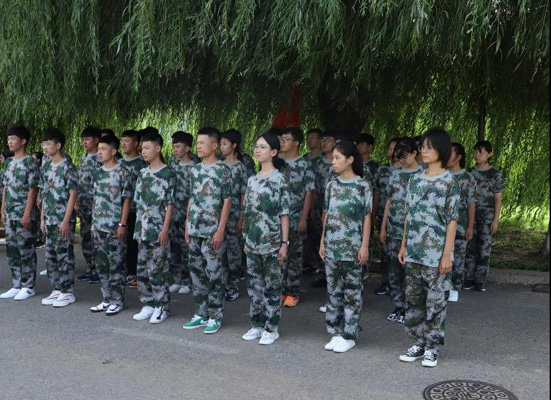 上午,太阳炙烤着大地,教官考虑到同学们的身体,带领同学们来到阴凉处继续训练。