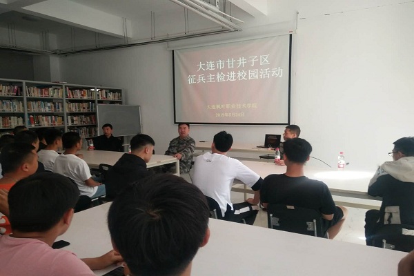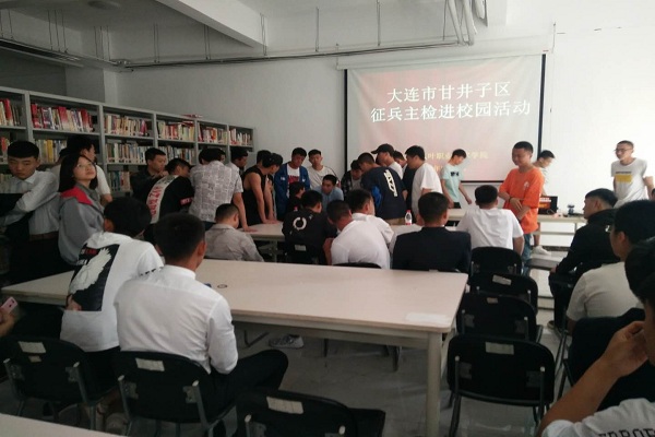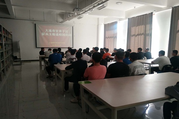 为做好学院2019年秋季征兵宣传工作,进一步贯彻落实2019年全国、省、市征兵工作会议精神,精准做好2019年毕业生参军入伍宣传动员工作,大连枫叶职业技术学院于2019年5月24日上午9点,邀请甘井子区武装部部长王仁安、军事科科长魏涛、军事办公室主任吕京国、甘井子区征兵主检主任夏楠,来学院为预报名学生做征兵政策解读和兵检方面的宣讲活动,活动地点设在学院图书馆一楼多媒体教室内,学院武装部部长高成林及2019年预报名同学90余人参加了宣讲活动。