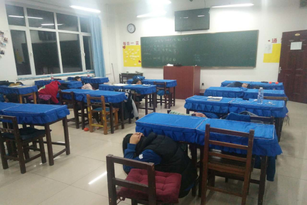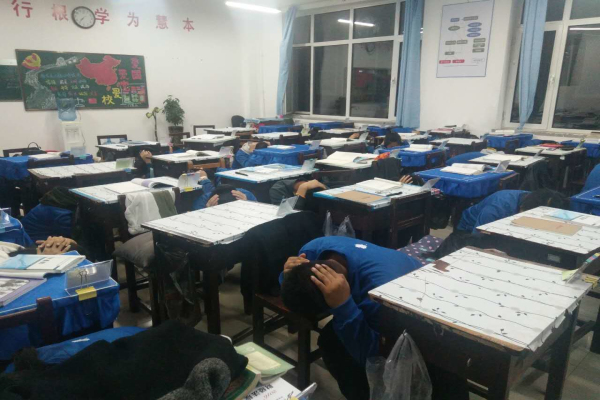 晚上19:38分,寂静的教学里突然响起刺耳的防震警报声音,听到防震警报后,楼层的值班老师迅速指导同学进行紧急避险,要在12秒内完成避险的正确选择,教室里同学都按着指令:双手护头,迅速蹲到课桌底下,等待下一步的指令。