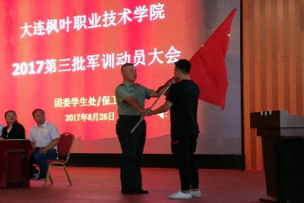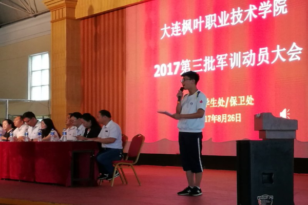2017年8月26日,大连枫叶职业技术学院2017第三批新生军训动员大会在我院综合馆顺利召开。学院副院长解建国、团委学生处/保卫处处长高成林、教务处处长张冬冬、招生工作处处长焦伶俐、财经商贸系主任林晓慧、副主任徐凤龙、工程技术系主任王晓琳、副主任刘姜青、现代服务系主任于庆霞、副主任闫博、中职部主任赵坤坤出席大会,团委学生处/保卫处处长助理吕运福主持会议。