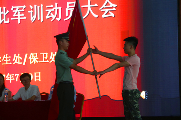 会上,高成林处长宣读了军训计划和军训教官聘任通报并用振奋人心的语言向在座的新生做了军训动员。在教官代表蔡铭宇和新生代表崔忠震发言过后,进行了激动人心的授旗仪式。当林青闯教官将鲜红的军旗交付到邱思博同学的手中时,现场响起了热烈的掌声。舞动的军旗和连绵的掌声激励了在场的每一个人,将大会的气氛推向高潮。