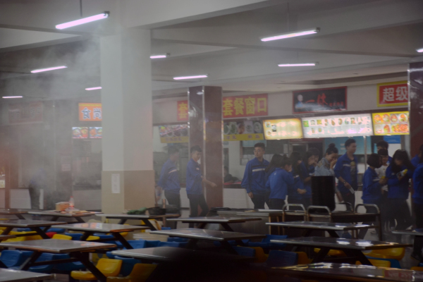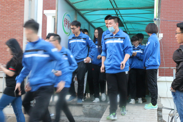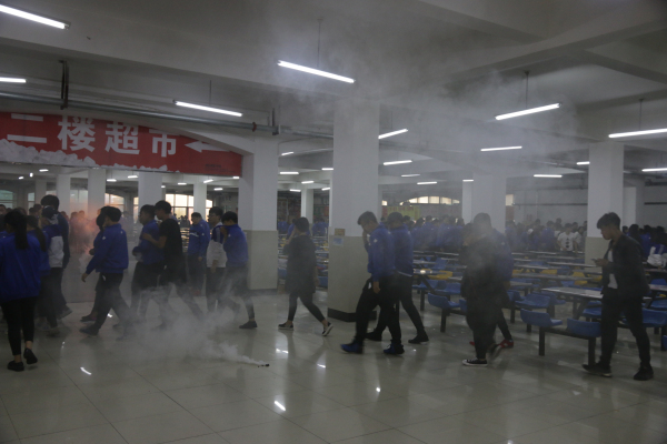 晚上18点50分,食堂大厅内突然浓烟弥漫,急促、刺耳的消防警报声响彻整个餐厅,学院指挥所人员下达组织疏散的命令,当日值班老师立即按照预案要求,迅速组织餐厅内的学生用衣袖捂住口鼻,弯腰低姿势快速疏散。所有同学从餐饮中心大厅全部撤离到安全区域,共用时2分06秒。