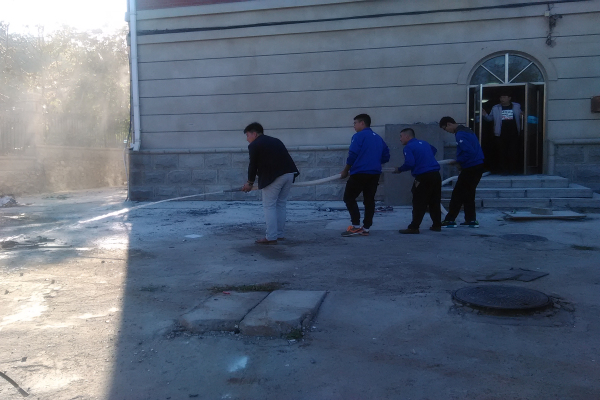李老师首先讲了4公斤手提式干粉灭火器的工作特点、使用范围、使用方法以及在灭火过程中特别要注意:一要站在火场的上风方向;二要离火场3-5米的距离;三要对准火焰的根部来回扫射。李老师又讲到干粉灭火器只适用于扑灭初期火灾,起到控制火势的作用,要想灭火彻底还得使用消防水龙带灭火。紧接着,李老师为大家讲解和示范了如何使用消防水带和水枪进行灭火,并现场进行了演练,手把手的教,一对一的练,到场所有同学都掌握了用灭火器灭火和用消防水龙带灭火的动作要领和技术要求。