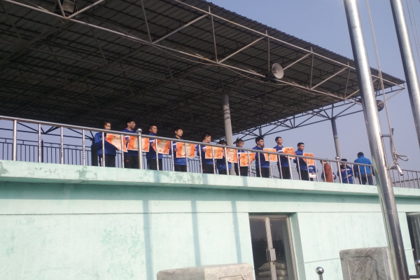 大会在激昂的义勇军进行曲中拉开序幕,迎国旗、升国旗、奏国歌在庄严、紧张、有序中进行着。