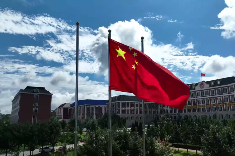 典礼在振奋人心的国歌声中正式拉开帷幕,无人机镜头划过学院上空,屏幕前的全体师生庄严肃穆、歌声嘹亮。
