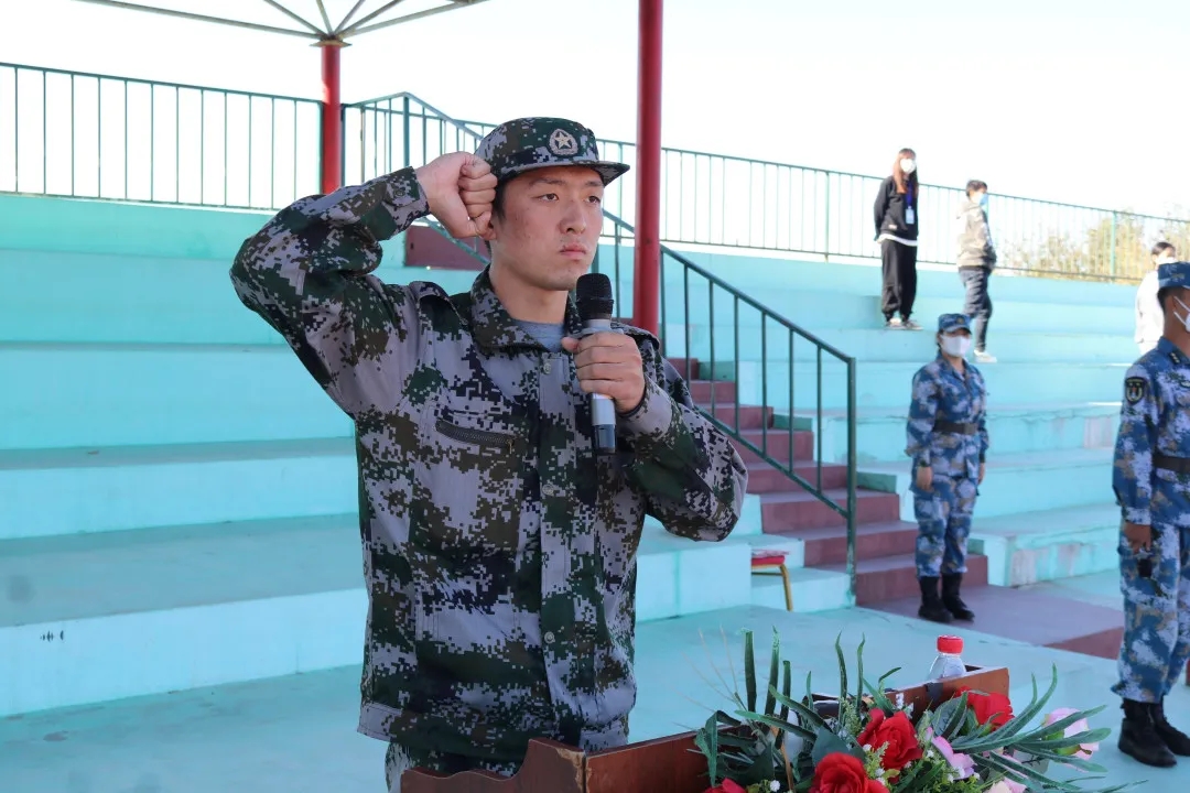 田忠良同学作为新生代表,带领全校同学进行入学宣誓,爱党爱国,有志有为,明德修身,自立自强,诚信做人,努力学习,遵纪守法,勤奋上进,团结互助,共同进步,用匠心筑梦,做职业精英,让枫叶常红,兴锦绣中华。