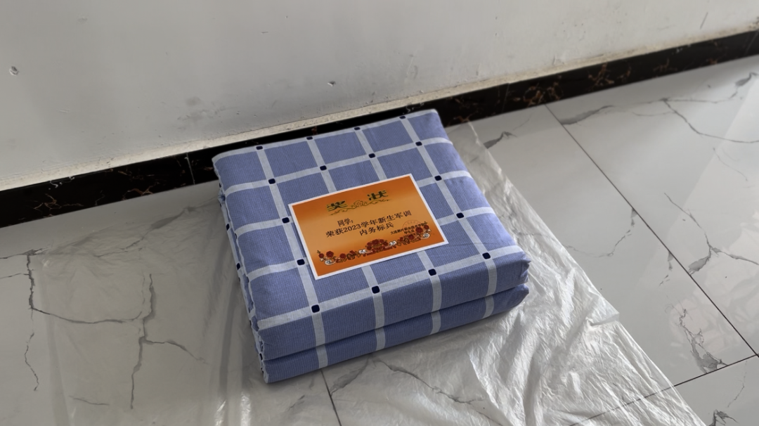 一床床整齐方正、棱角分明的“豆腐块”呈现在面前,展示了学生们日常的训练水平。随后各位评委通过对参赛选手的被子平整度、整体美观度、尺寸、边线棱角和整体效果等认真评比,将手中的奖状颁发给最标准的“豆腐块”。