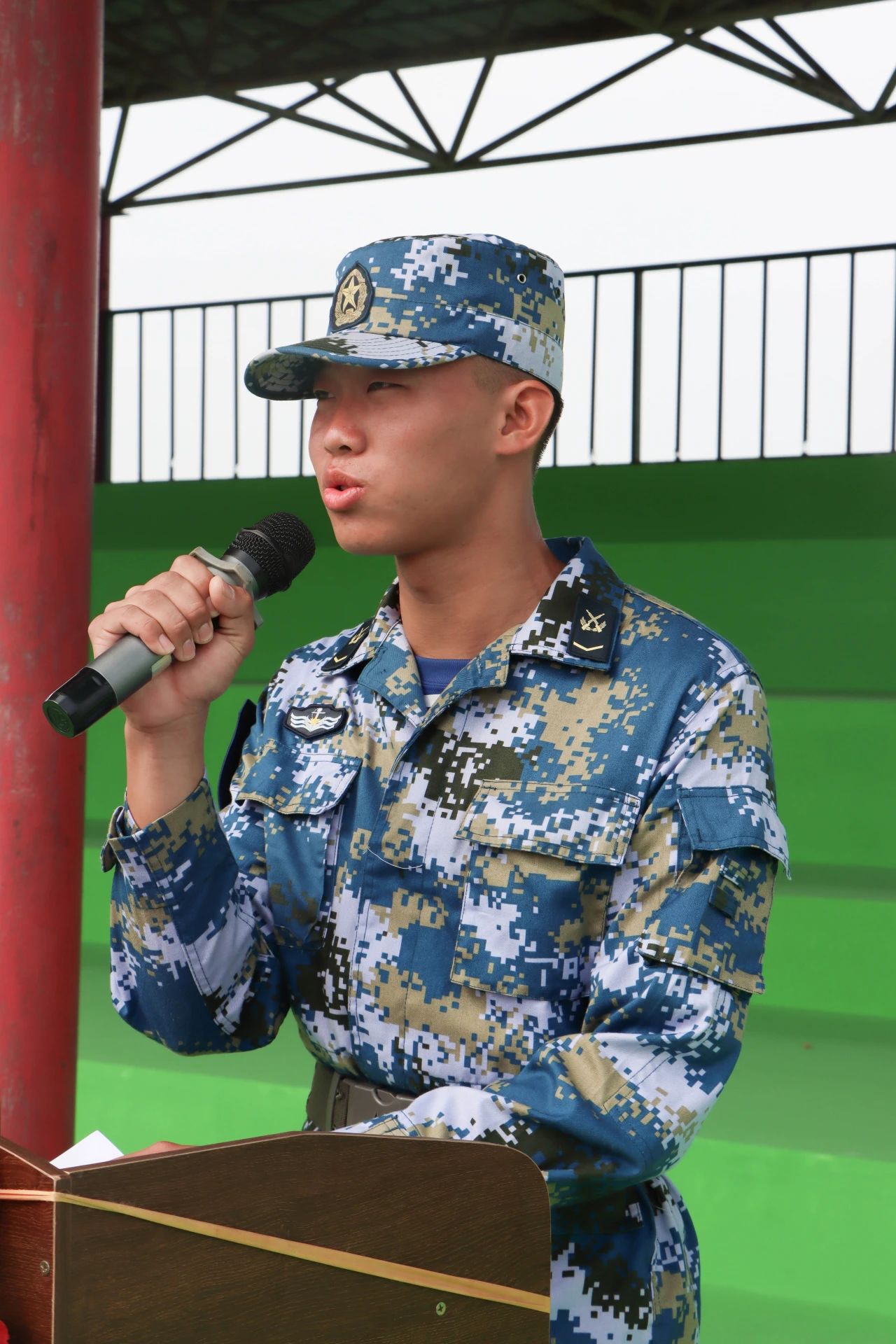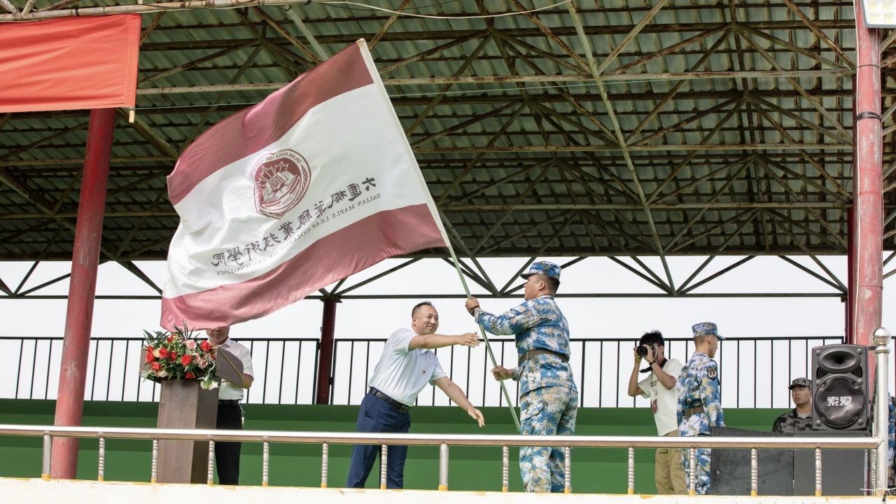 副院长解建国向军训教官王升锦授旗,将校旗与意志传递。鹏程万里奋今朝,壮士豪情谱新篇。军训砥砺报国志,整装待发齐上阵。