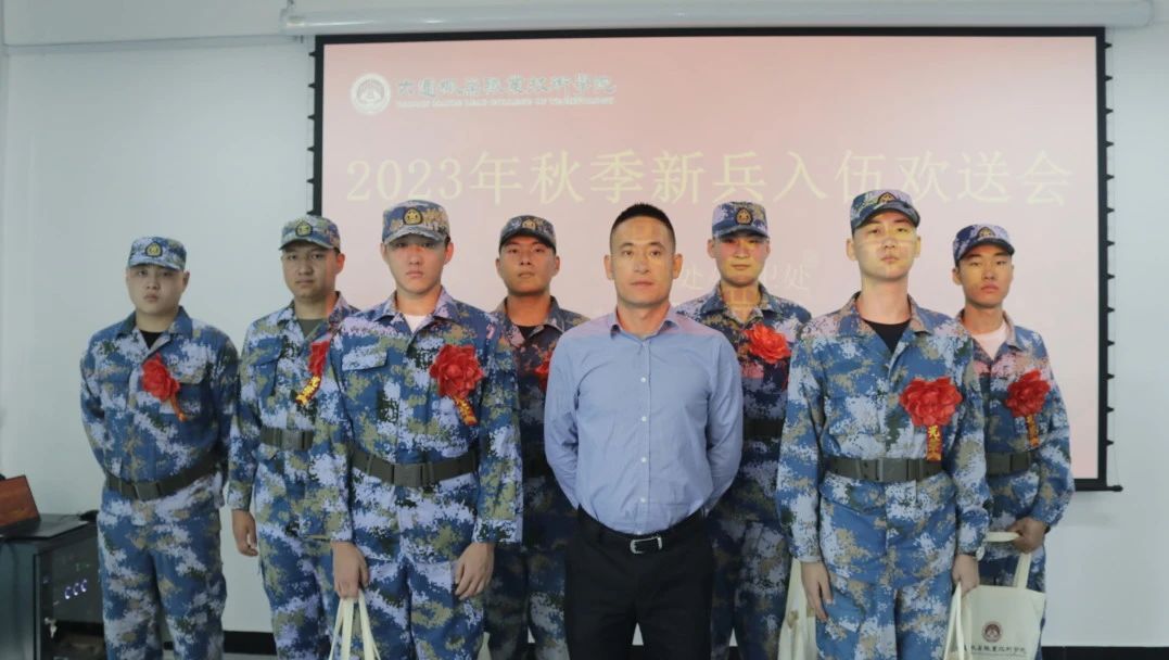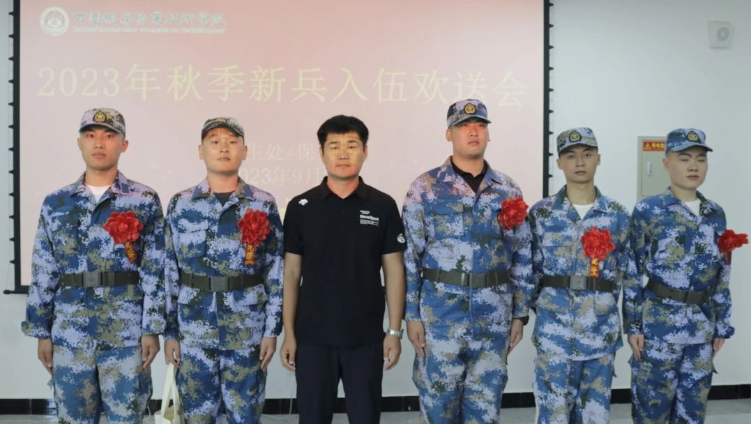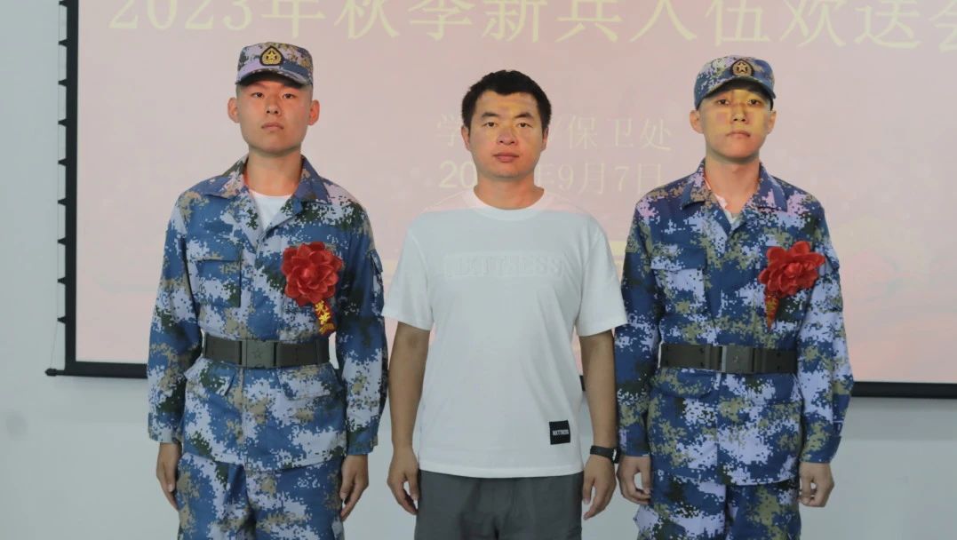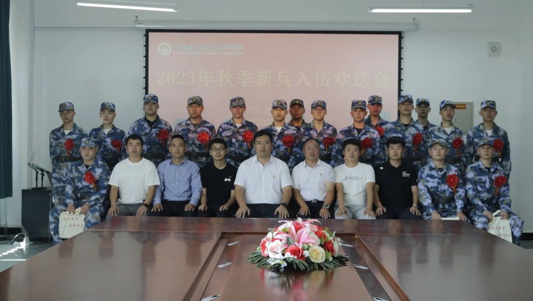2023年9月7日上午11点, 我院召开秋季新兵入伍欢送会,出席本次会议的有学生处/保卫处处长高成林、学生处/保卫处处长助理吕运福、财经商贸系学管主任孙永海、现代服务系学管主任鲁广豪、信息工程系学管主任段正南、装备技术系学管主任姜占原以及医养康护系学生管理主任杨世平。