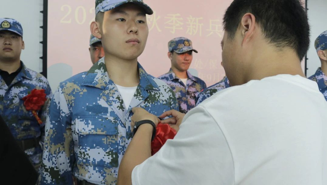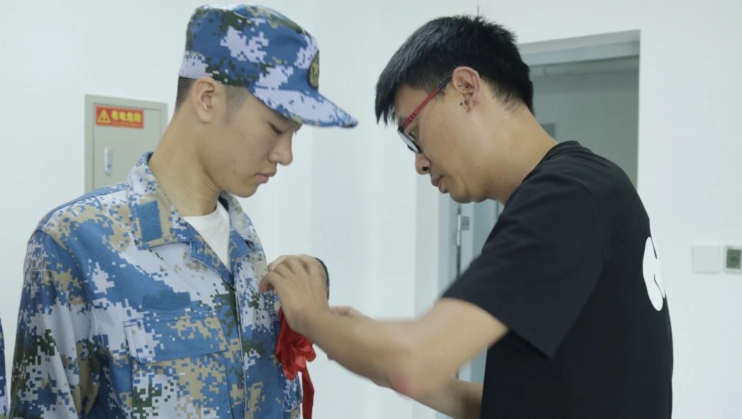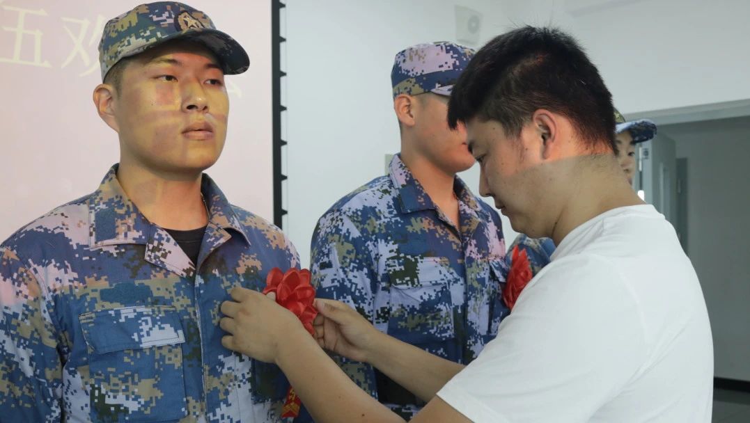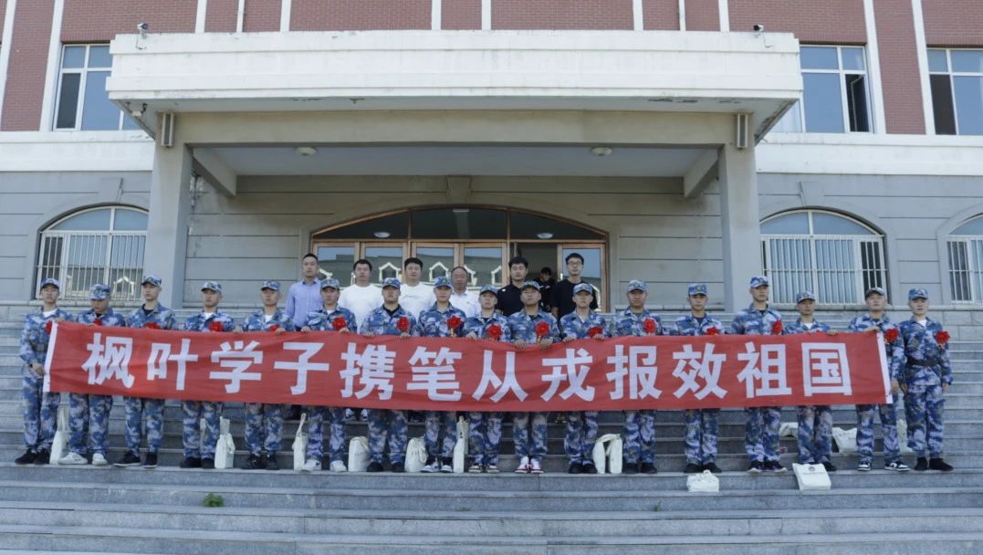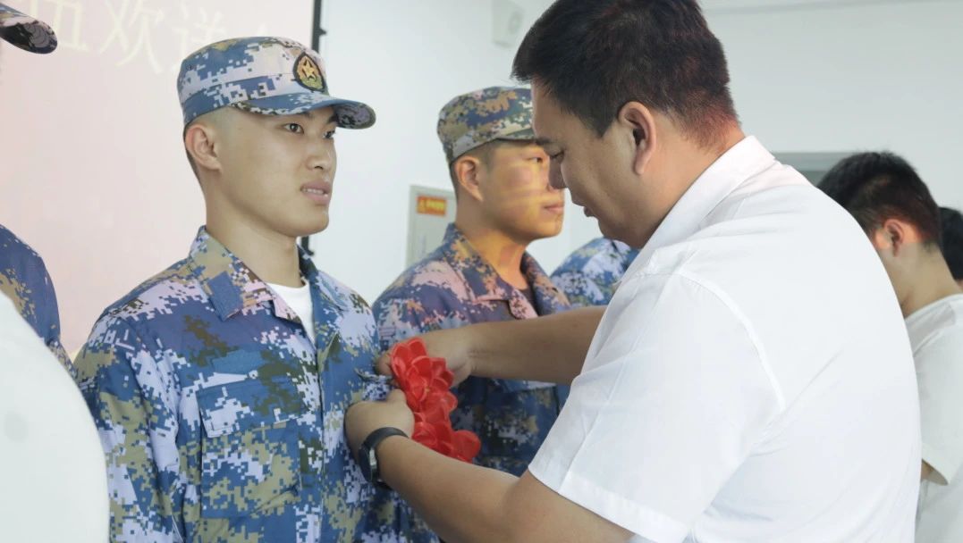 领导老师为每一名新兵佩戴大红花,对同学们踊跃参军入伍的爱国之情给予了肯定与赞扬。并向同学们表达一要加强学习,提升素质,要在部队这所大学校里,严格要求自己,刻苦学习知识,不断提高素质,掌握过硬本领,尽快实现由一个普通青年到一名合格军人、优秀军人的转变;二要遵规守纪,发奋图强,要热爱军营生活,钻研军事技能,乐于吃苦,勇于奉献,以争先进、创一流的精神状态积极投身于丰富多彩的军营生活中;三要练好本领,报效祖国,要将报国之情体现到一言一行上,熔铸在一岗一哨里,从本职工作做起,干一行、爱一行、精一行,努力实现自身价值,展示壮丽人生,不辜负家乡父老乡亲的期望,为家乡争光、为枫叶添彩。