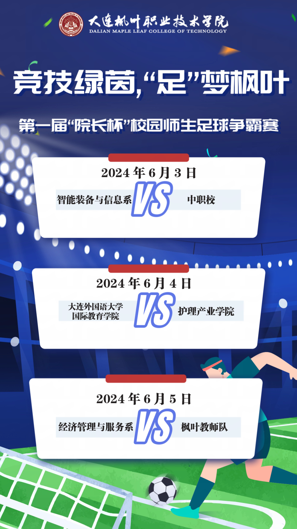 为了进一步推动校园体育文化发展,丰富枫叶学子课余生活,提高身体素质,培养自信心和团队精神,校团委特此举办了“竞技绿茵,‘足’梦枫叶”第一届“院长杯”校园师生足球争霸赛。