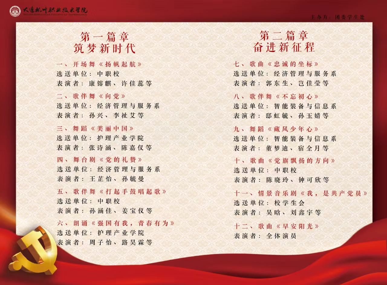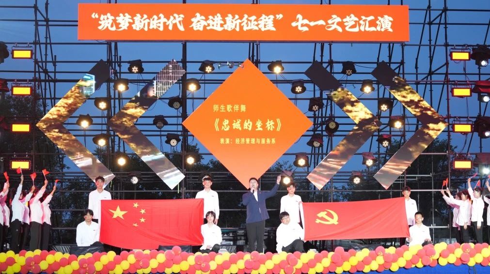 为庆祝中国共产党成立103周年,回望党的光辉历史,歌颂和发扬党的奋斗精神和优良传统,提高学院各级党组织的凝聚力并引导党员发挥先锋模范作用,大连枫叶职业技术学院7月1日18:30于学院运动场隆重举行“筑梦新时代,奋进新征程”主题七一文艺汇演,副院长兼纪委书记解建国、院长助理兼招生办主任高成林、教务处处长初金美、智能装备与信息系党委书记兼教学副主任高源、集团董事长助理艾立斯、学生处处长王博、纪委常务副书记兼保卫处处长孙成军、党委宣传部副部长兼信息中心主任薛飞、党委组织部负责人银雄出席本次活动。