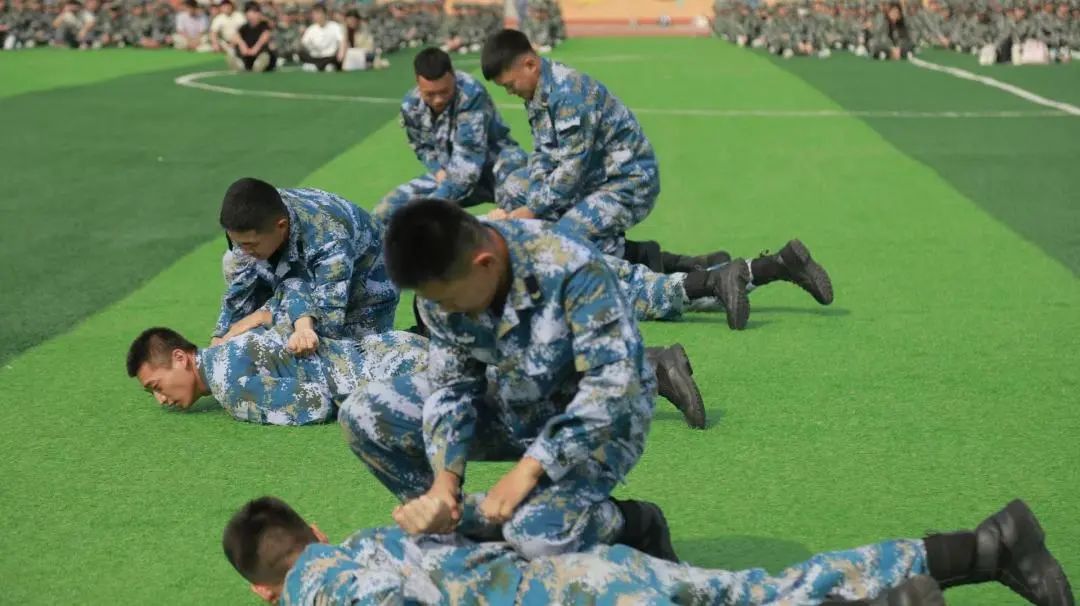 迷彩戎装,英姿飒爽。教官们带来擒敌术表演和战术表演。表演如同一道璀璨的闪电,瞬间吸引了所有人的目光。身姿矫健,眼神凌厉,拳风呼啸,似猛虎下山,霸气十足,一招一式尽显军人的果敢与坚毅。