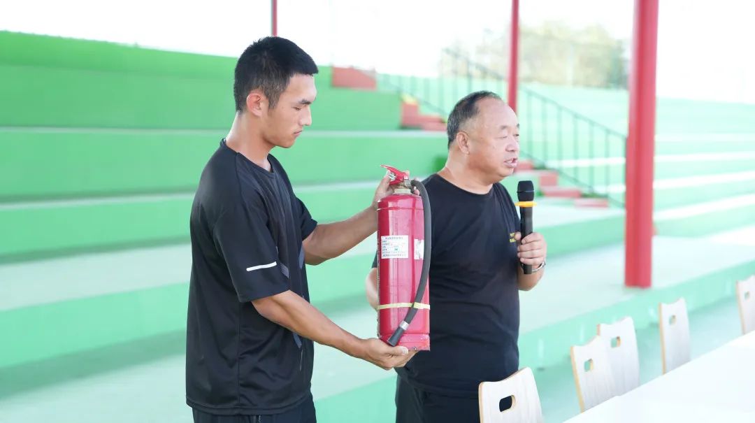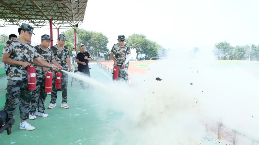 在同学们结束消防演习后,保卫处干事吕运福向同学们进行了灭火器的使用教学。